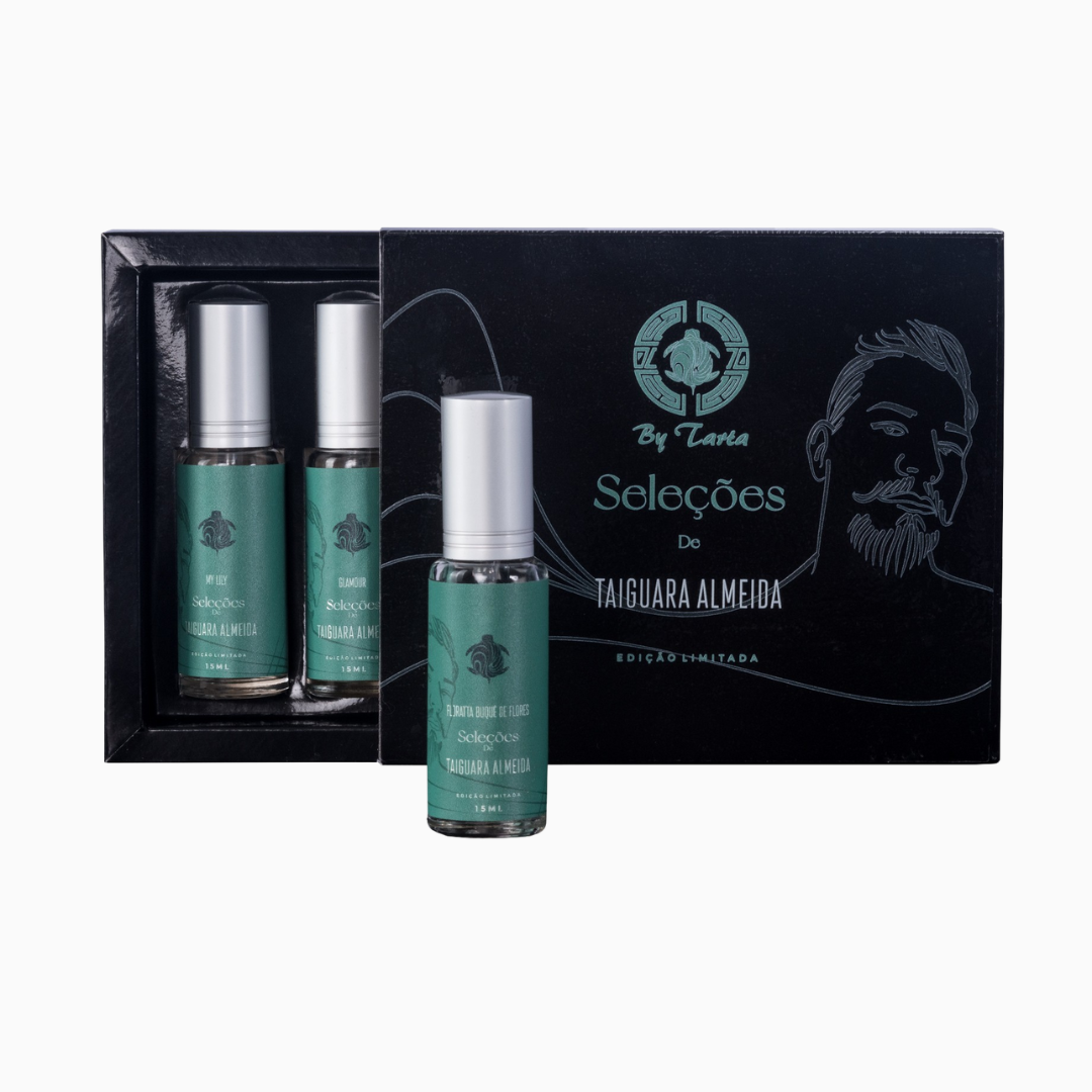 Box Seleções Taiguara Almeida, contendo 4 frascos com 15ml de contratipos inspirados em fragrâncias especiais selecionadas pelo amante da perfumaria Taiguara Almeida, para o gênero feminino.